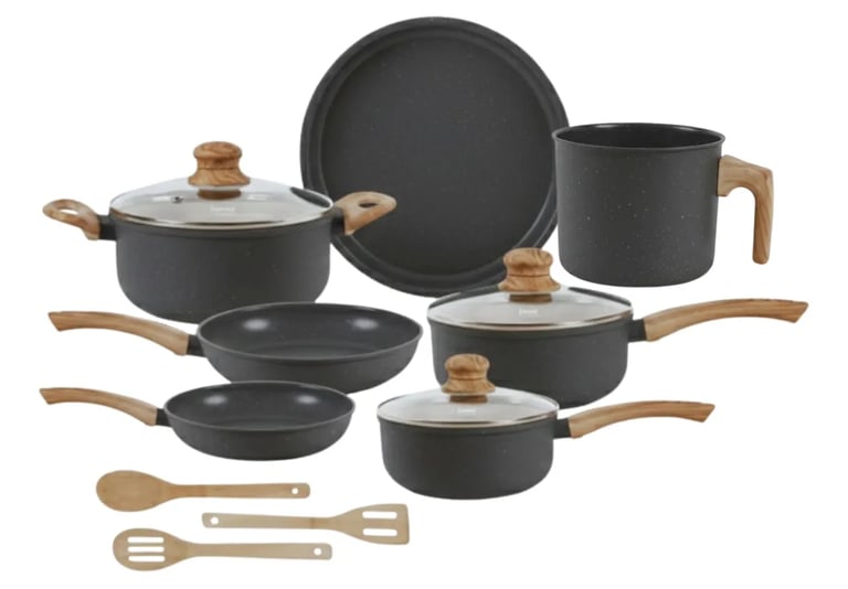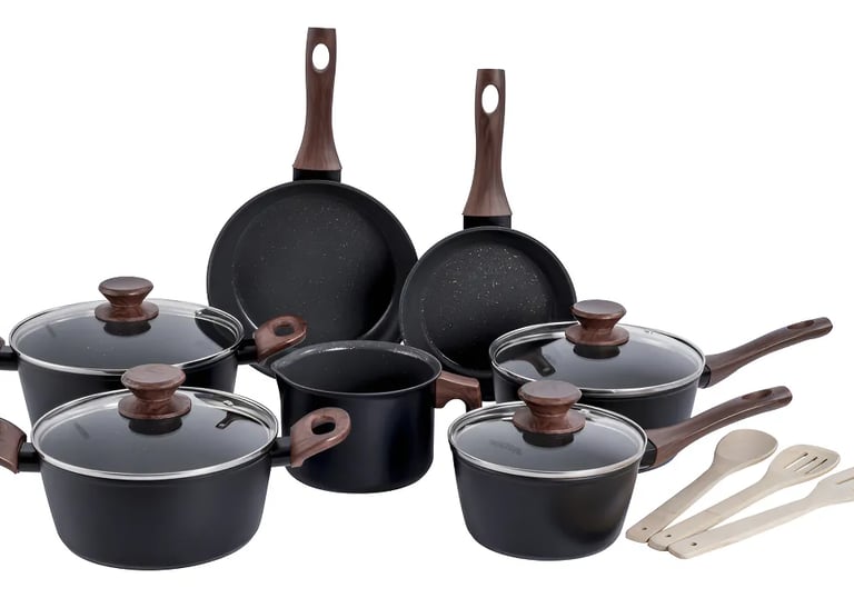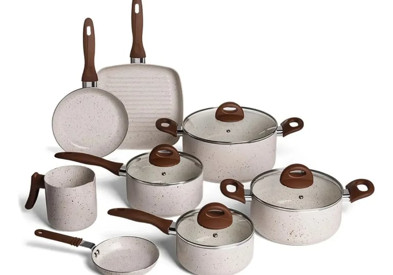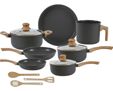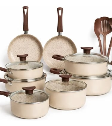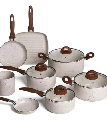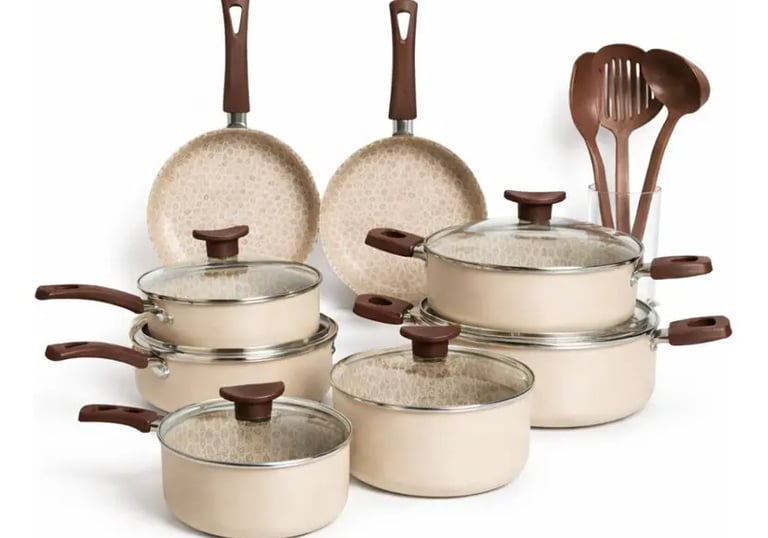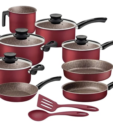Esse conjunto chama atenção por oferecer várias peças por um valor acessível, sendo uma boa opção para quem está montando a cozinha ou quer renovar tudo de uma vez.