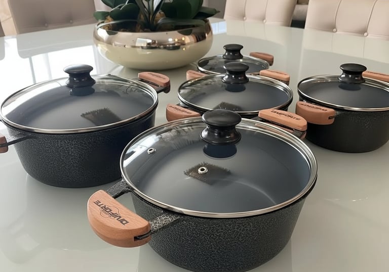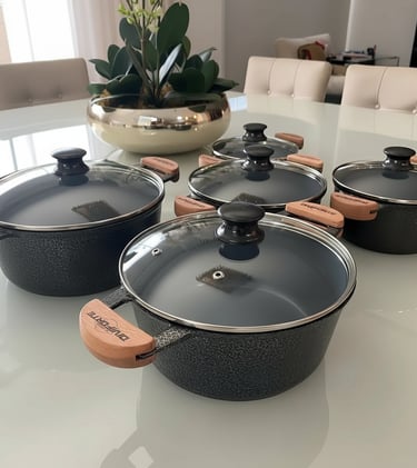 Esse conjunto chama atenção pelo acabamento mais refinado e pela sensação de produto mais robusto. É aquele tipo de panela que você compra e sente que está levando algo acima da média.